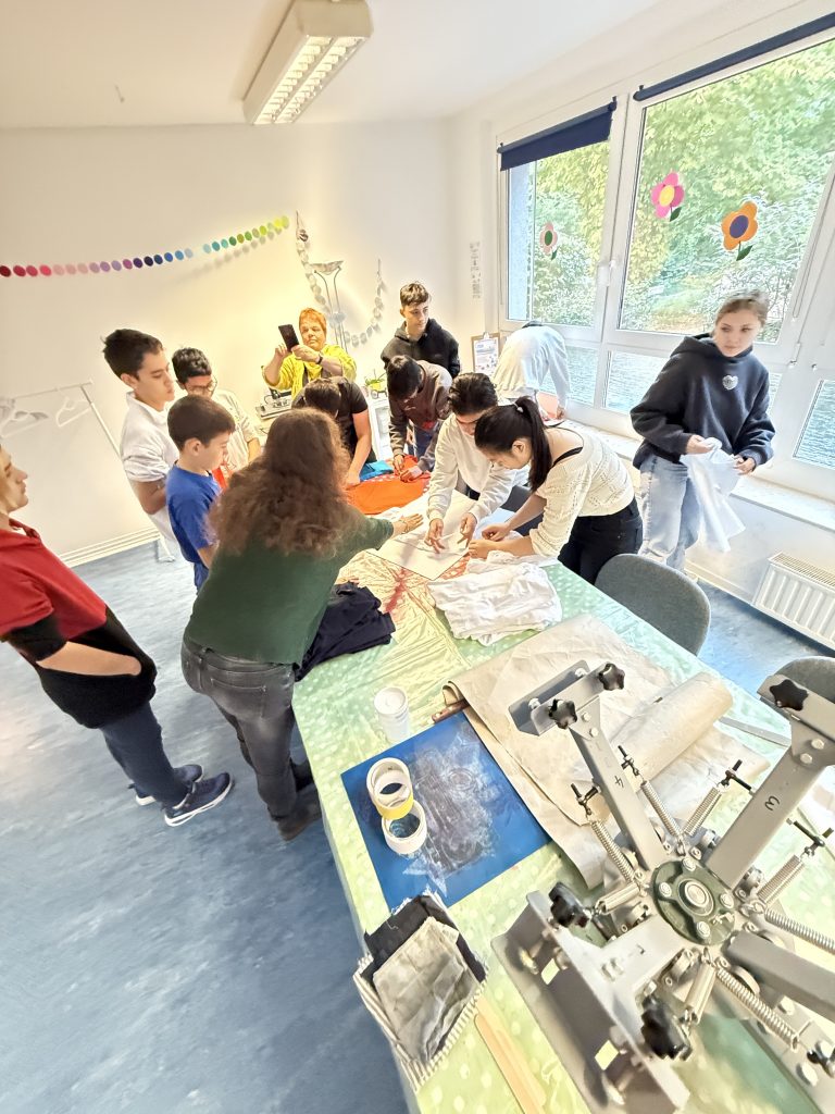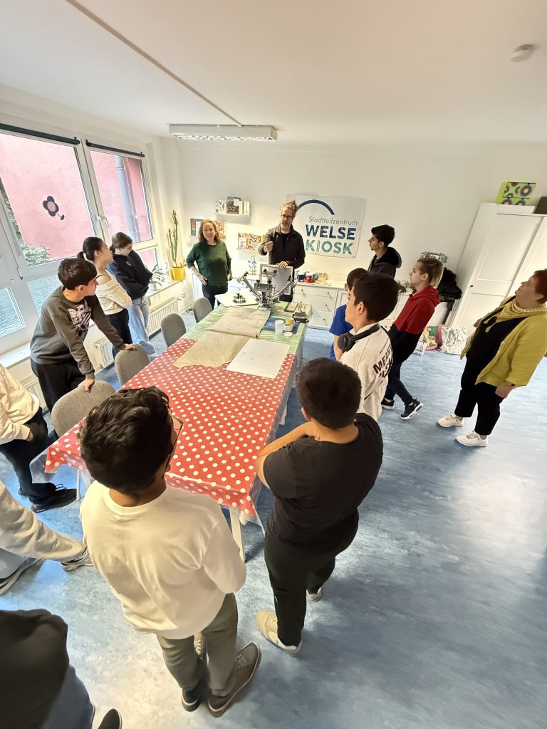 Am 29. September 2025 nahmen Schülerinnen und Schüler der Willkommensklassen 2 und 3 an einem Siebdruckworkshop im Welsekiosk teil. Nach einer kurzen Einführung entwarfen sie eigene Motive und druckten diese selbstständig auf Papier und Stoff. Die Jugendlichen zeigten großes Interesse und arbeiteten engagiert und kreativ. Der Workshop bot nicht nur künstlerische Abwechslung, sondern stärkte auch den Teamgeist der Gruppen.