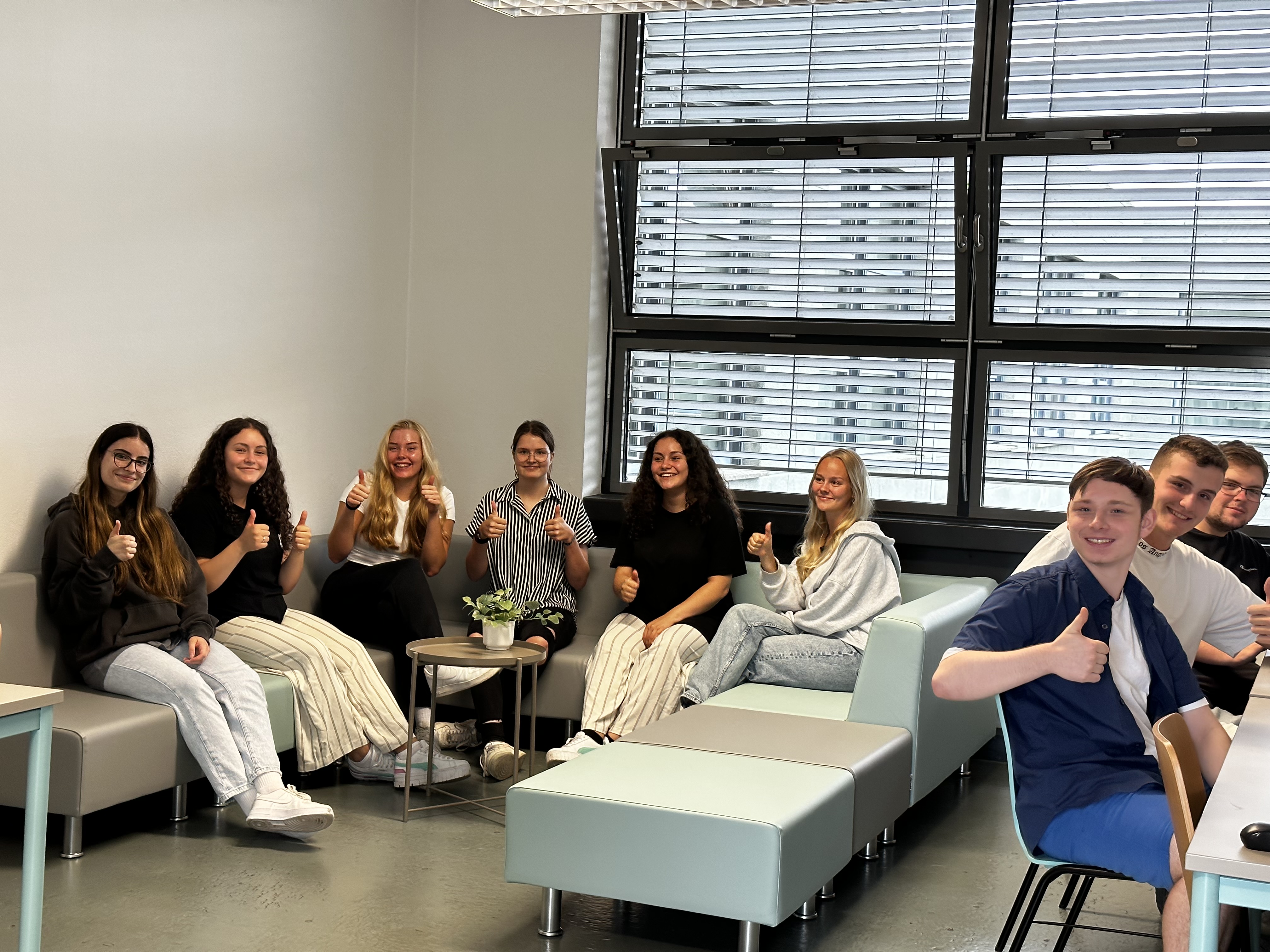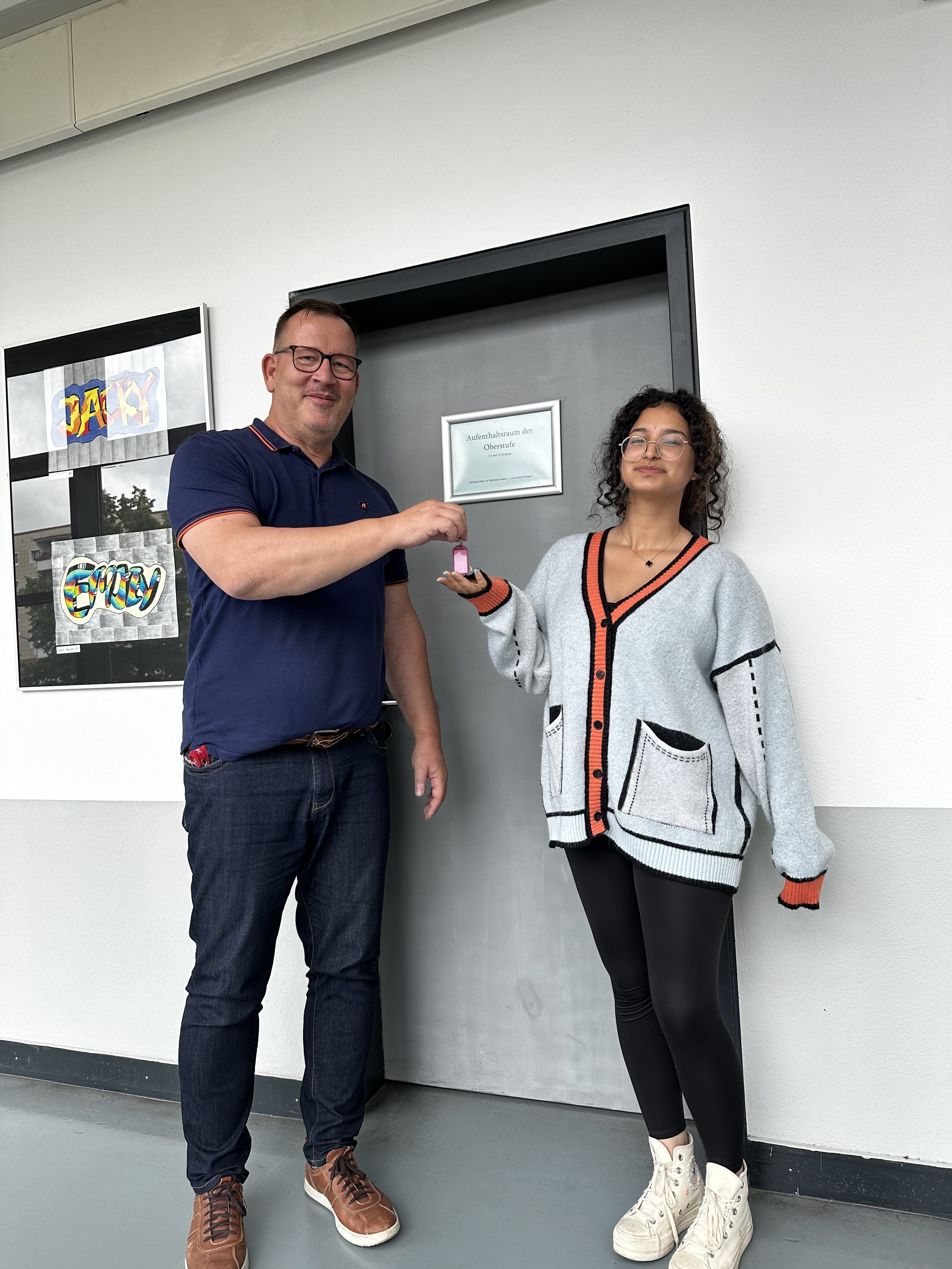 Heute (13. September 2023) wurden die neugestalteten Räume der Oberstufe ( R 1.30 und R 2.17) wieder zur Verfügung gestellt. Die Schlüsselübergabe an die SchülerInnensprecherin Rulaf Blal erfolgte. In der Projektwoche wurden durch SchülerInnen der Jahrgänge 12/13 die Wände gemalert und grafisch gestaltet. Die Schule investierte 12000€ in das neue Mobiliar und hofft, dass nun eine Umgebung geschaffen wurde, die in den Freistunden der Arbeit oder zur Entspannung dient. Vielen Dank an die vielen Händen, die zum Erfolg dieses Projektes beitrugen. Daumen hoch!