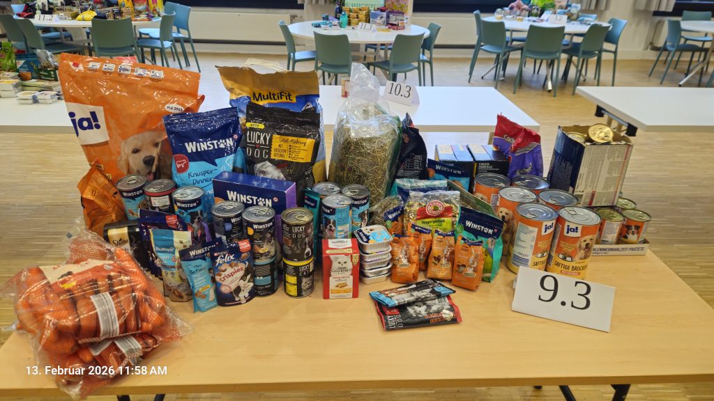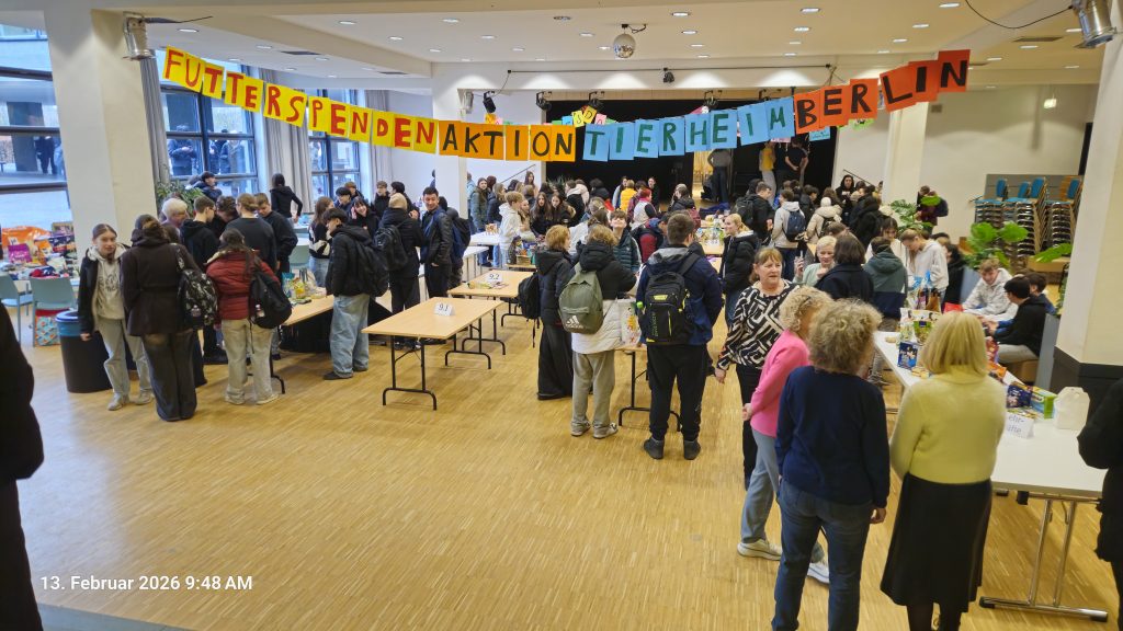 Gemeinsam haben wir einen riesigen Berg Futter gesammelt, der nun den Tieren im Europas größtem Tierheim Berlin, Hausvaterweg 39, 13057 Berlin zugutekommt. Ihr habt gezeigt, dass unsere Schule ein großes Herz für Tiere hat!