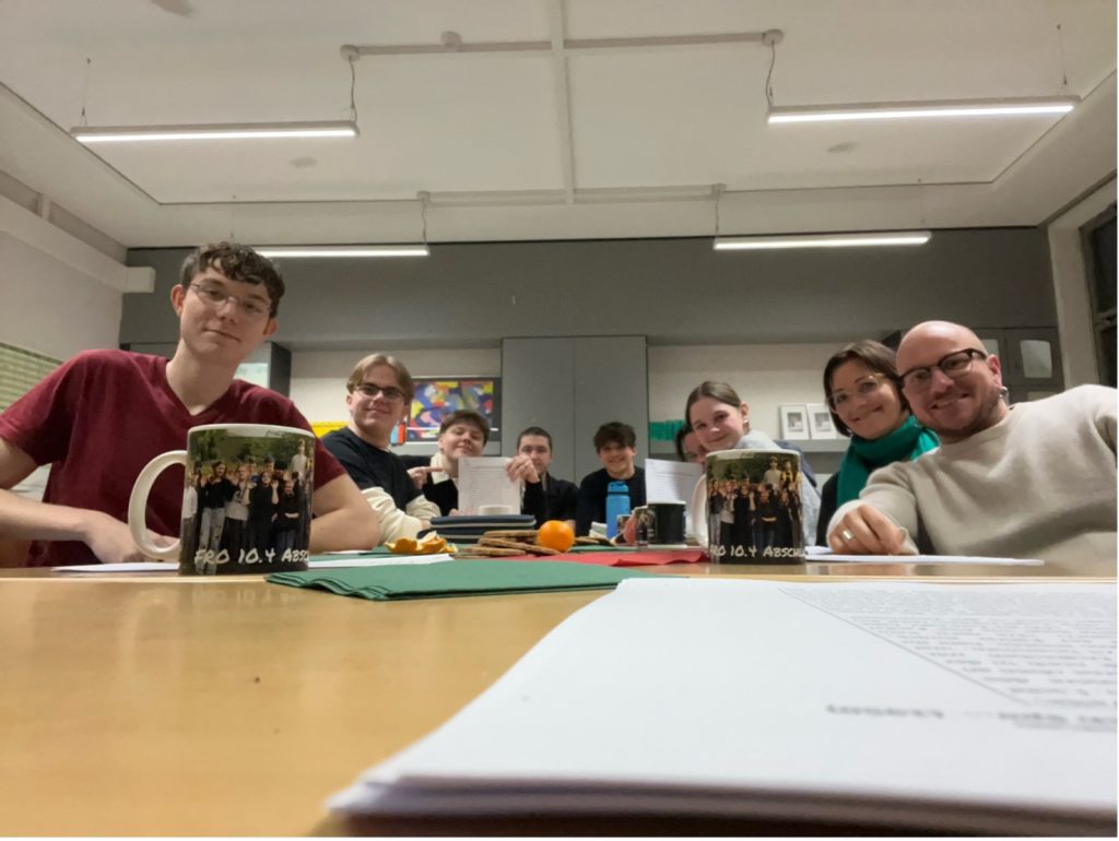 Am 11. Dezember 2025 haben sich am Nachmittag einige Literaturinteressierte der Oberstufe zusammengefunden, um zusammen mit Frau Haupt und Herrn Sautmann über die Kurzgeschichte „Wanderer, kommst du nach Spa…“ von Heinrich Böll zu philosophieren. Zwischen Diskurs und Snacks saßen wir zusammen und haben uns genauer mit der Relevanz von Bildungsidealen im Nationalsozialismus auseinandergesetzt (im Text genannte Figuren waren hier Nietzsche, Zeus, Friedrich der Große u.a.). Heinrich Böll selbst war zur Zeit des Nationalsozialismus an der Front und schreibt in der Kurzgeschichte aus der Sicht eines jungen Soldaten, der, nachdem er im Krieg schwer verletzt worden ist, zurück zu seinem Gymnasium gebracht wird, das inzwischen als Lazarett dient. Die Realität des Krieges wird so auf eine abstrakte, indirekte Art und im Fokus der Vorbildfiguren der NS-Zeit dargestellt. Nachdem wir die Geschichte durchgelesen und besprochen hatten, durften wir in einem kleinen Gallery-Walk noch einmal die genannten Figuren genauer kennenlernen und haben ein Abschlussgespräch darüber geführt. Nach der intensiven Auseinandersetzung mit dem Text sind wir zum Hier und Jetzt übergegangen und haben Vergleiche zum Heute gezogen, sind Ängste durchgegangen und haben uns in aktuellen Themen verloren. Bis in den Abend hinein sprachen wir so über diverse, anschlussfähige Diskussionsthemen, bis wir letztendlich gegen 19:30 Uhr den Abend beendeten. Wir alle sind mit neuen Erkenntnissen und erfüllter Wissbegierde nach Hause gegangen. Wir können jedem nur empfehlen, solch ein Angebot mit offenen Armen anzunehmen!