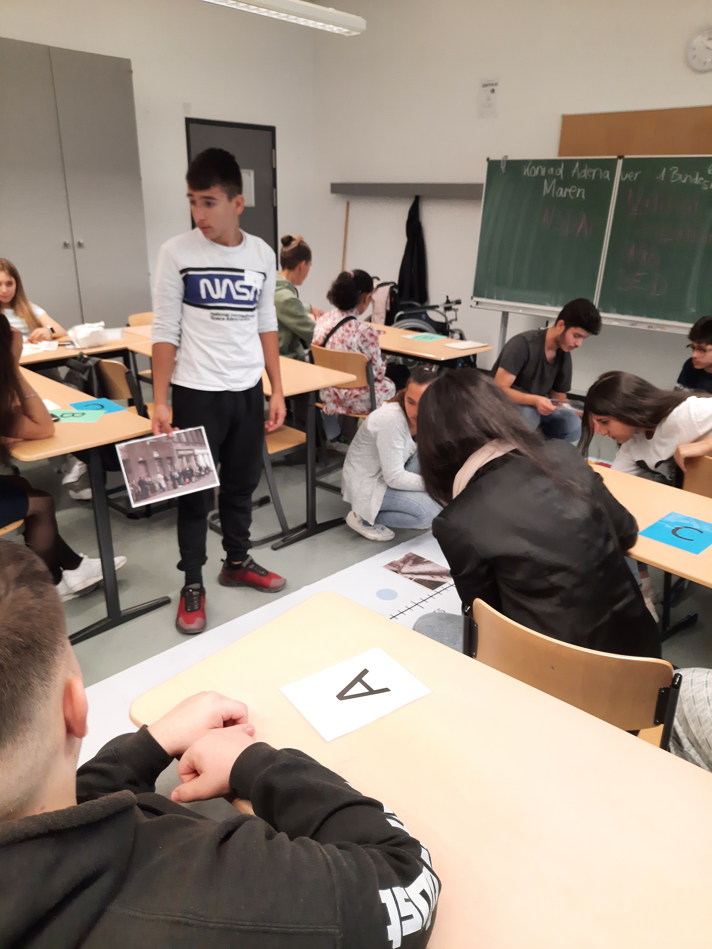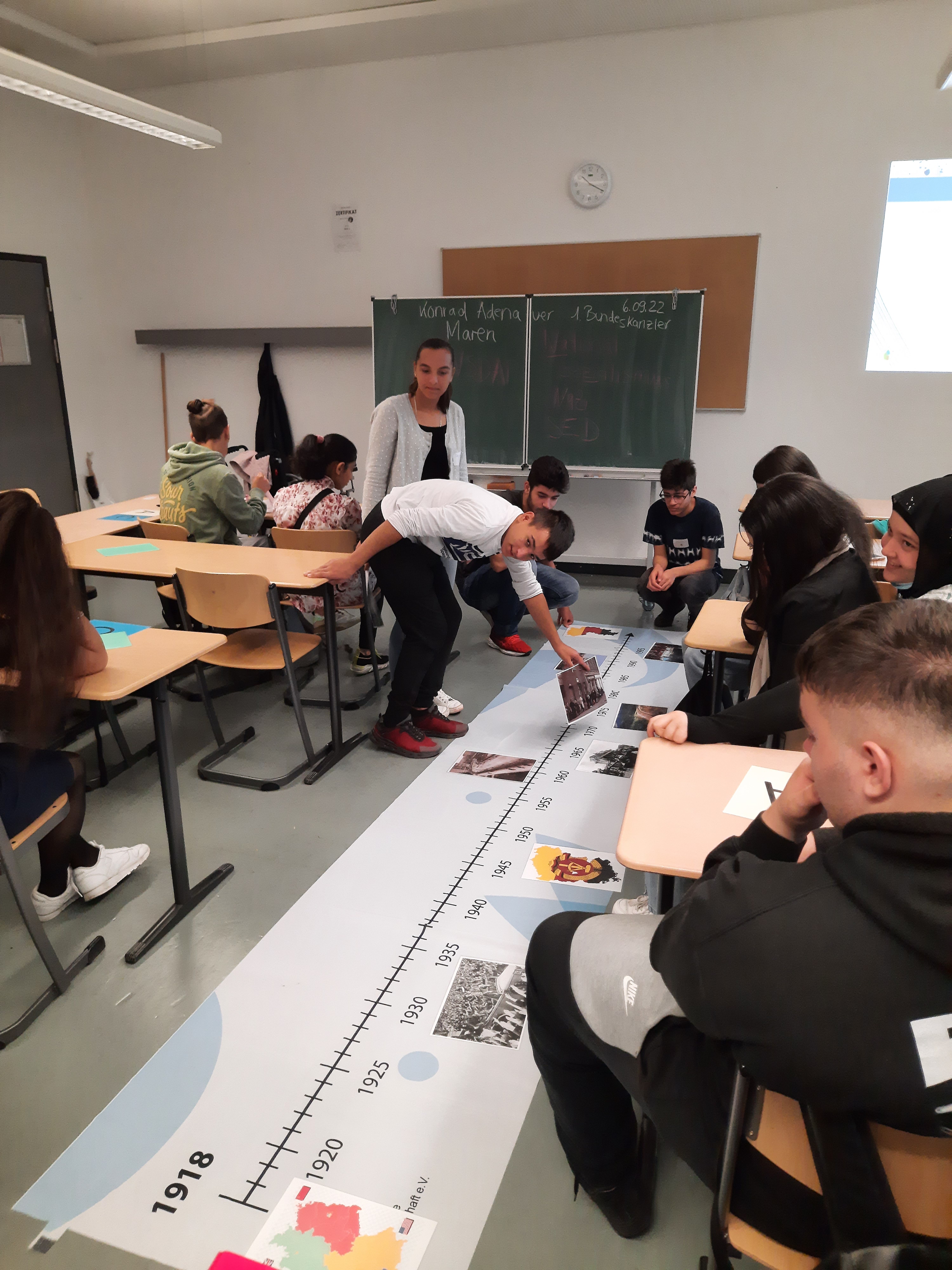 Hierfür wurde die Zeit des Nationalsozialismus, ihr politischer Höhepunkt im 2. Weltkrieg und die daran anknüpfende Teilung Deutschlands thematisiert. Anhand von Bildern und einem interaktiven Zeitstrahl konnten die Schüler*innen die geschichtlichen Ereignisse zeitlich einordnen und kommentieren.