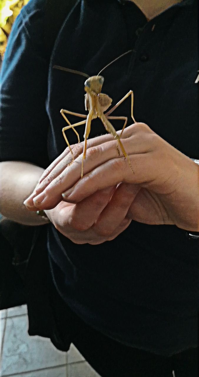 Katharina holte auch noch eine Gottesanbeterin und Achatschnecke hervor. Die Gottesanbeterin durften wir nicht anfassen, weil sie zubeißen kann.